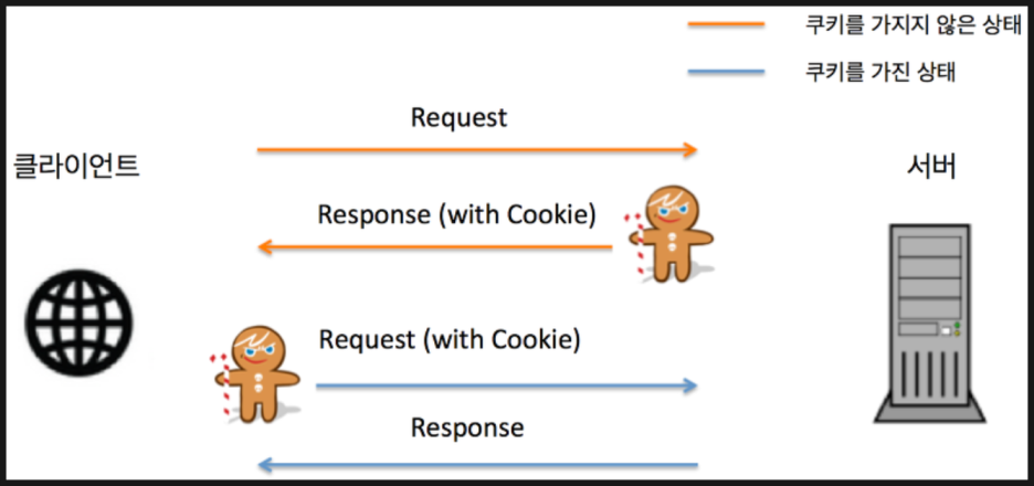서버는 이에 응답함 (response) 이 때, 사용자가 원하는 데이터와 페이지 정보도 주는데 여기에 쿠키 정보도 섞어서 줌